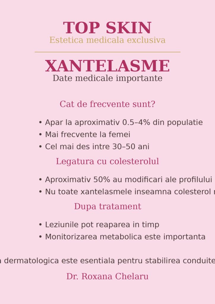 In general, Xantelasma nu este o leziune periculoasa in sine, dar poate fi un indiciu ca organismul are nevoie de o evaluare metabolica. Privita corect, nu este un motiv de frica, ci o ocazie de a avea mai multa grija de sanatatea ta.
